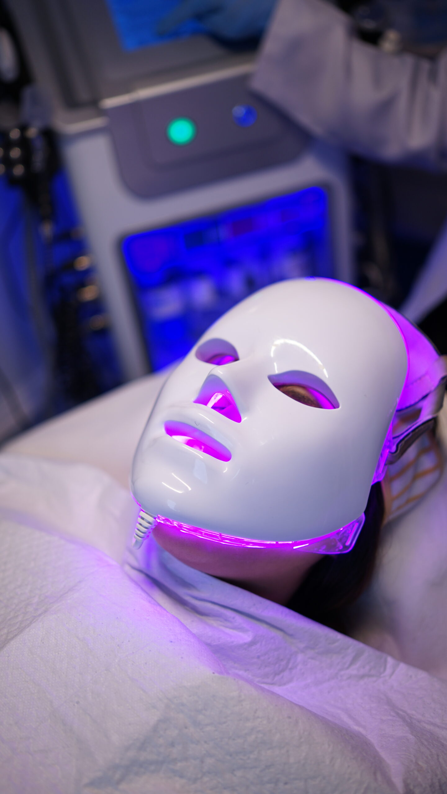 A vacuum-like tool extracts blackheads and other impurities, followed by hydrating serums to nourish the skin.